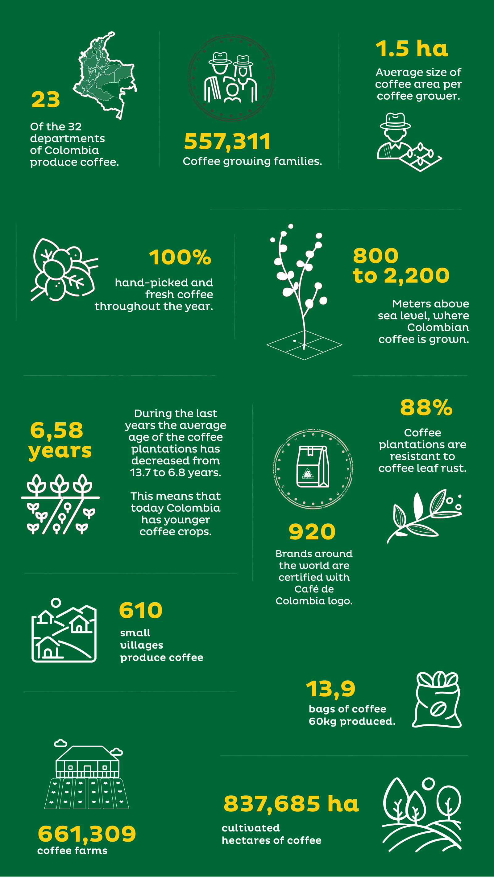 Along the almost 3,000 kilometers of inter-Andean valleys, from the southern end to the northern tip of Colombia, more than half a million coffee families live on small farms or plots, whose coffee crops, on average, do not exceed two hectares. Their solidarity, commitment, search for the common good and sustainable development, form a social and strategic capital and a model of peace for Colombia. They are dedicated to transmitting the best of themselves in their artisanship. In order to appreciate a cup of Colombian coffee, it is important to know the work and effort of these families.