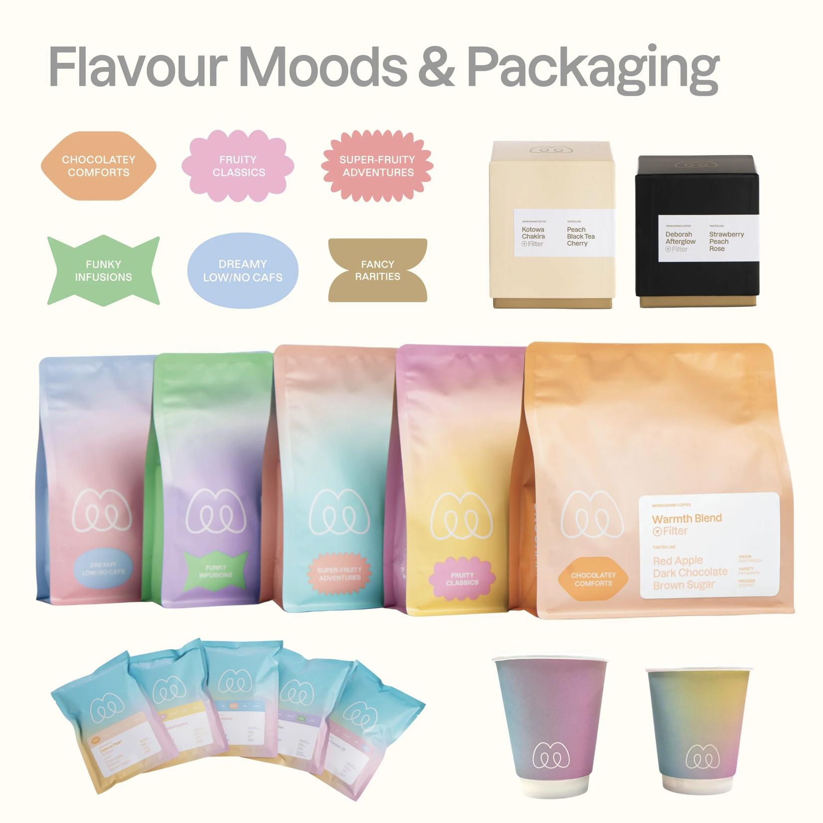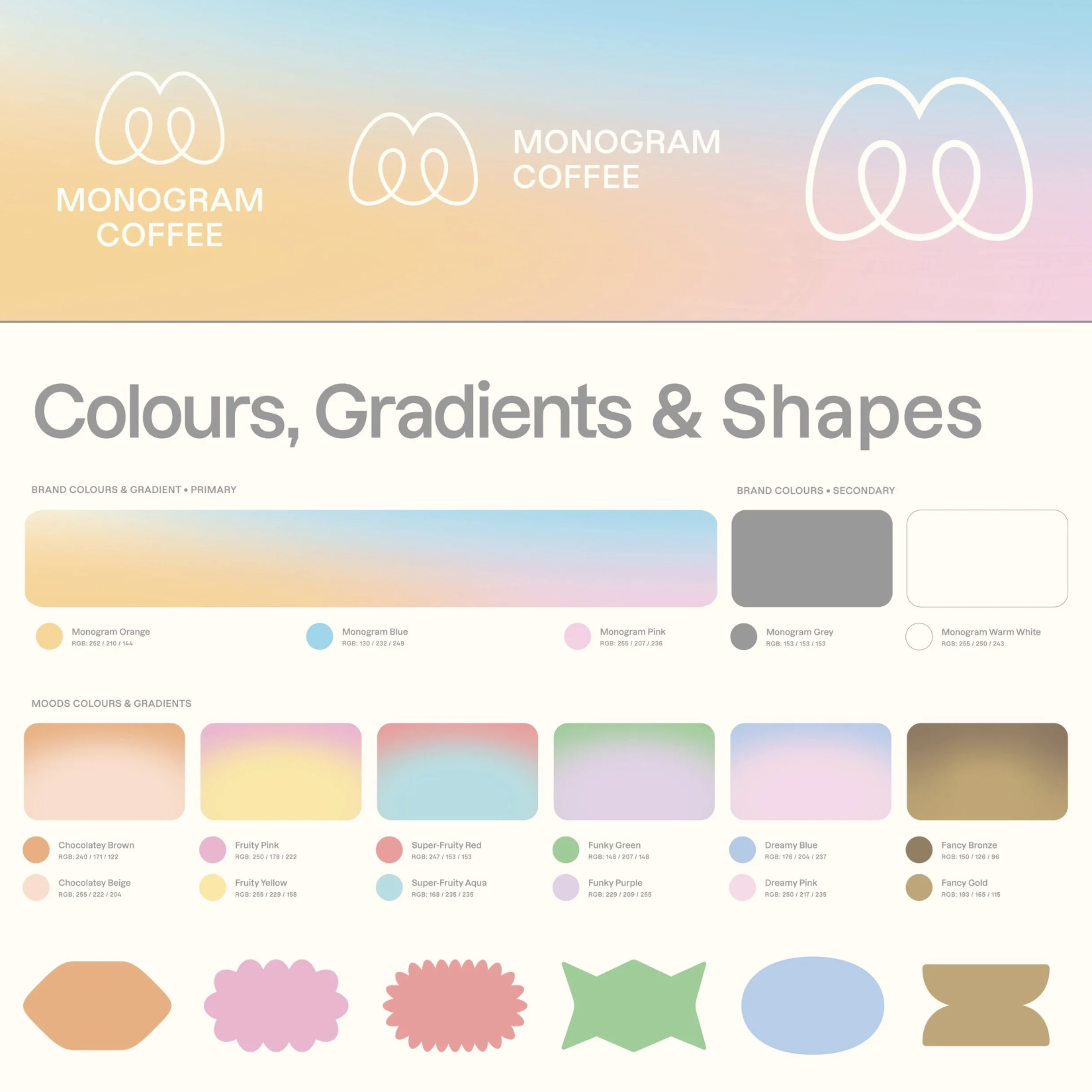 Monogram Coffee’s rebrand was designed to make the world of specialty coffee more intuitive, expressive, and welcoming. Coffee flavour can be complex and often difficult for new drinkers to navigate, so the goal of the design was to translate that complexity into something visual, emotional, and easy to understand. At the centre of the system is the Flavour Mood framework, which organizes coffees into approachable sensory categories such as Chocolatey Comforts, Fruity Classics, Superfruity Adventures, Funky Infusions, and Dreamy Low + No Cafs. Instead of relying only on technical origin information, the design communicates flavour through colour and visual personality. This allows customers to discover coffees based on how they like their coffee to taste.
