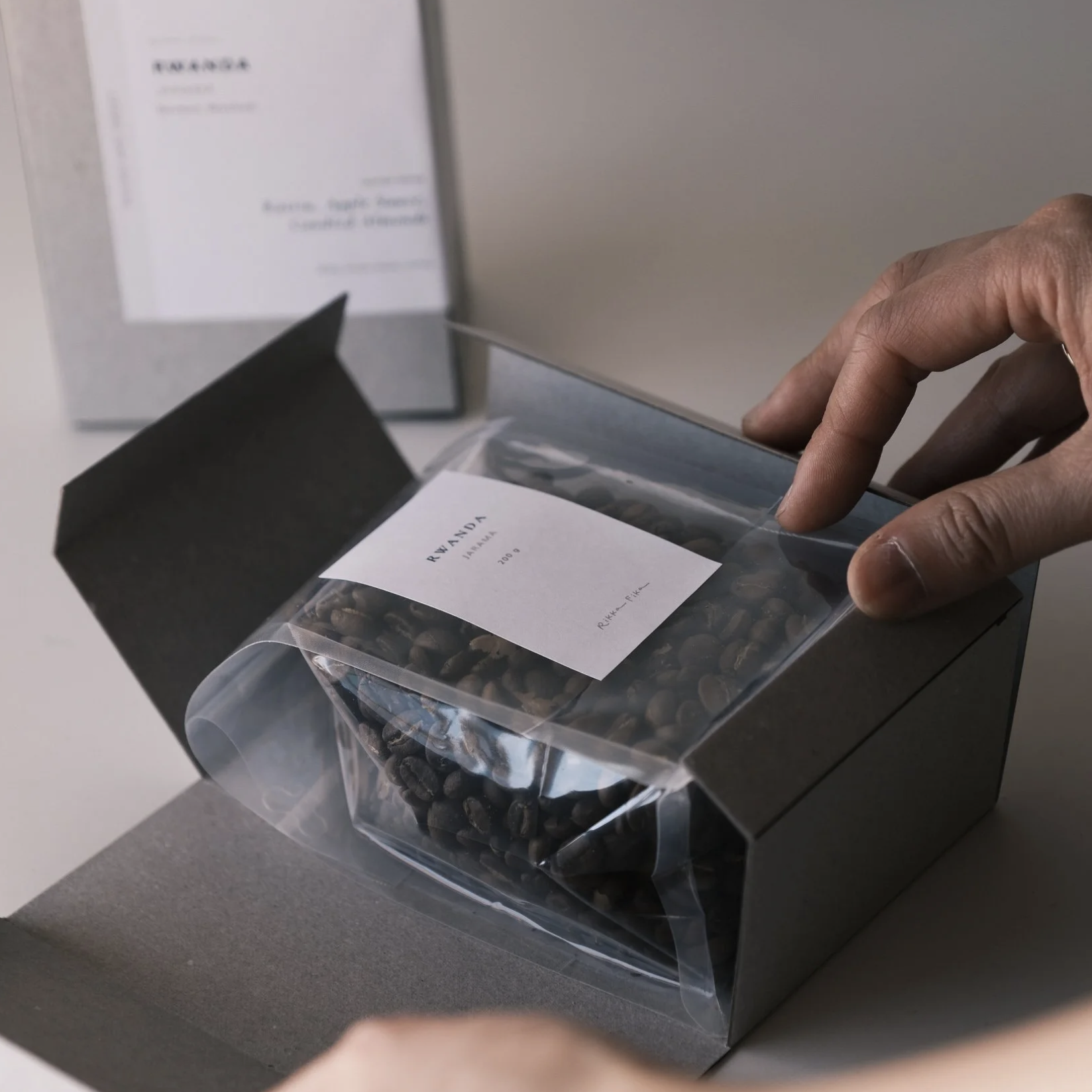 This packaging was conceived with sustainability as the starting point. The structure was designed around a corner-stapled construction, allowing the joining method to inform the geometry, proportions, and overall visual presentation. Visible staples led us to explore references beyond conventional coffee packaging, drawing inspiration from jewelry and stationery objects that feel tactile, intentional, and enduring. The form was approached as a small treasure chest, inviting anticipation and turning the act of opening into part of the coffee ritual.